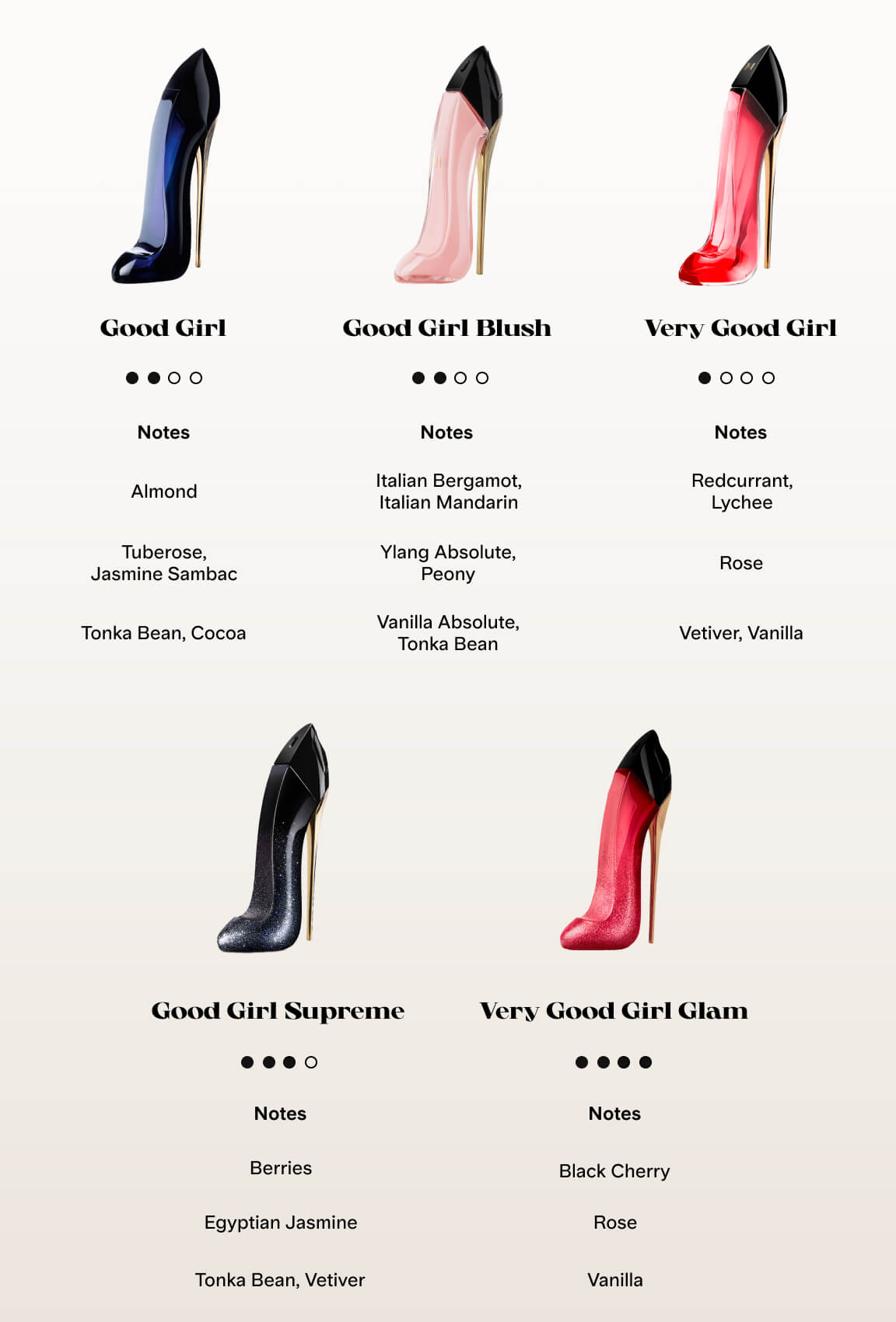 Senaste tillskottet i Good Girl-kollektionen är en mjukare och mildare tolkning av originalet. Dess blommiga och fruktiga toner av jasmin, ros och röda bär framkallar en känsla av lekfullhet, vilket gör den till ett idealiskt val för dagtid eller stunder när en subtil men charmig och varm doft önskas.