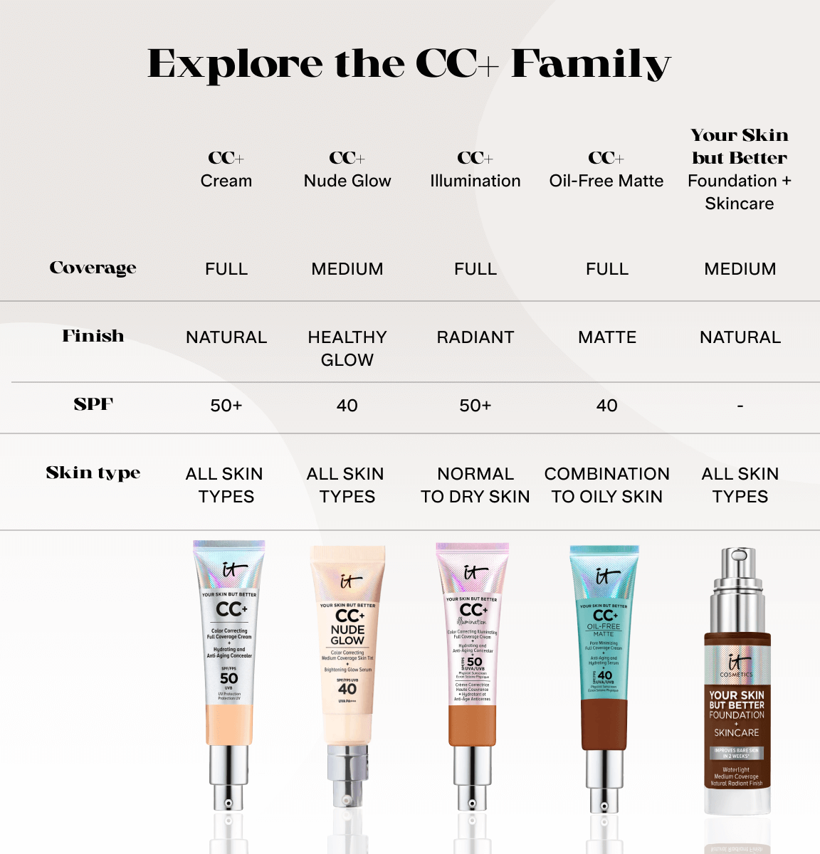 "Smink möter hudvård" är orden som summerar IT Cosmetics ikoniska CC+ serie. Här hittar du skonsamma foundations som passar alla hudtyper. Oavsett om du har acne, rosacea, oljig, känslig eller torr hud – finns det en variant för dig. Scrolla vidare för att läsa mer.